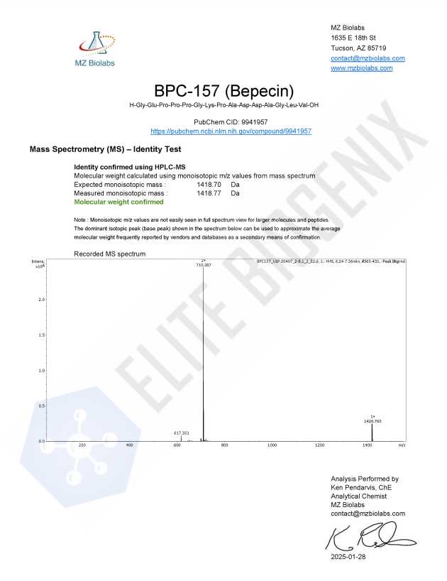 At EliteBiogenix, we provide research-grade BPC-157 in both 5mg and 10mg lyophilized vials, verified at ≥99% purity through: