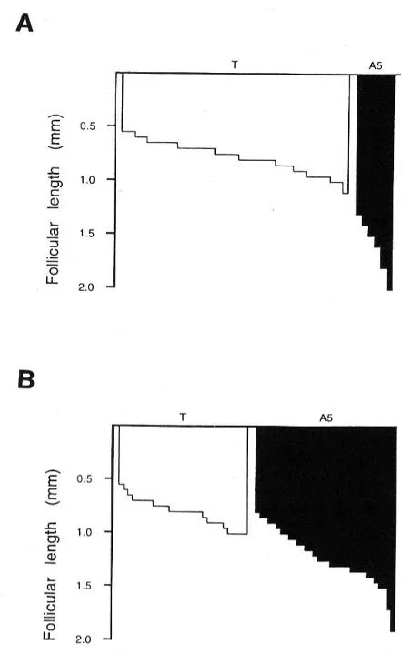 Fig. 1) Folliculogram showing sequential patterns of the relative number of hairs at pretreatment (A) compared to 5 months after RU58841 treatment (B). At pretreatment, most hairs are in telogen phase (T) which is a resting state. However, after 5 months of RU58841 treatment, most hairs are in anagen phase (A5) which is a growth phase. Adapted from Pan et al., Endocrine 9(1):39-43.