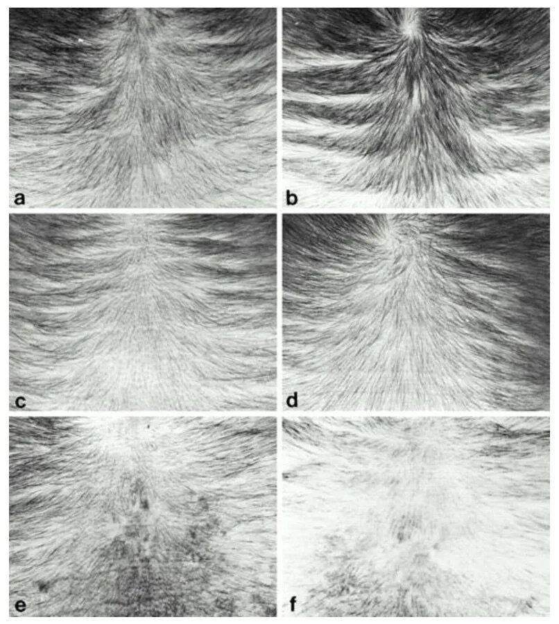 Fig. 2) Photographs showing effects of topical RU58841 on hair regrowth on bald frontal scalps. Increased density and length of hairs were observed in a scalp at 4 months after treatment with 5% RU 58841 (b) compared with the scalp at the pretreatment time (a). A slight increased density of hairs was noticed in a scalp at 4 months after treatment with 0.5% RU 58841 (d) compared with the scalp at the pretreatment time (c). A control-treated scalp showed no signs of hair regrowth (e) at pretreatment time compared to 4 months later (f). Adapted from Obana et al., Endocrinology 138(1) 356-361.