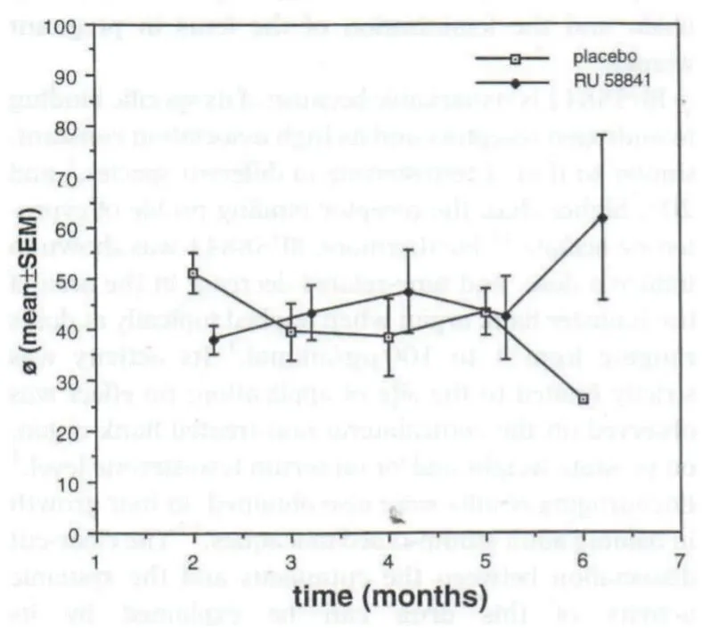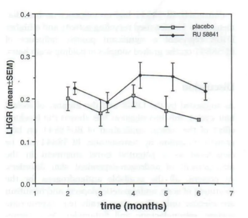 Fortunately, RU58841 is an ideal candidate since it displays an absence of systemic effects in animals at doses up to 100X the local active dose. RU58841 is remarkable due to its specific binding constant to AR, similar to that of testosterone, and 20% higher than cyproterone acetate. Its activity is strictly limited to the site of application: no effects were observed in the contralateral flank, on prostate weight, or on serum testosterone level. This clear-cut distinction between the skin surface activity versus systemic effects.